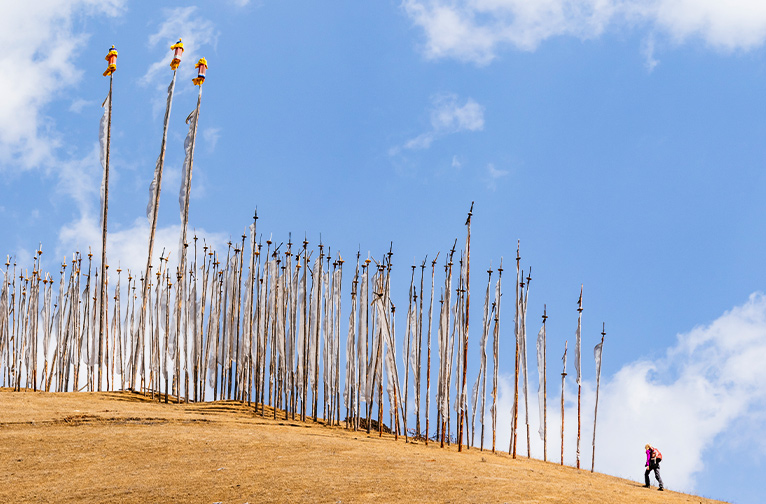 Lungdhars, the sacred flags which come in two shapes—square or rectangular—can be seen hung horizontally or diagonally on a string. Look for them at mountain passes, bridges, and around monasteries or stupas, where they are elevated on wooden poles or flung over a rope.