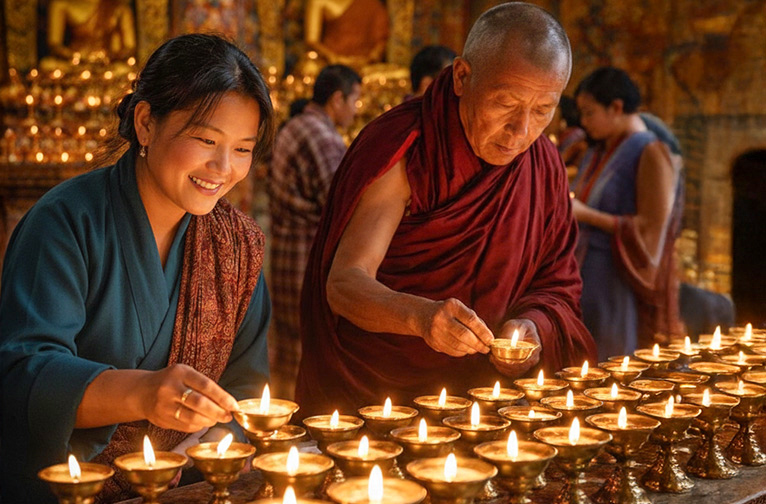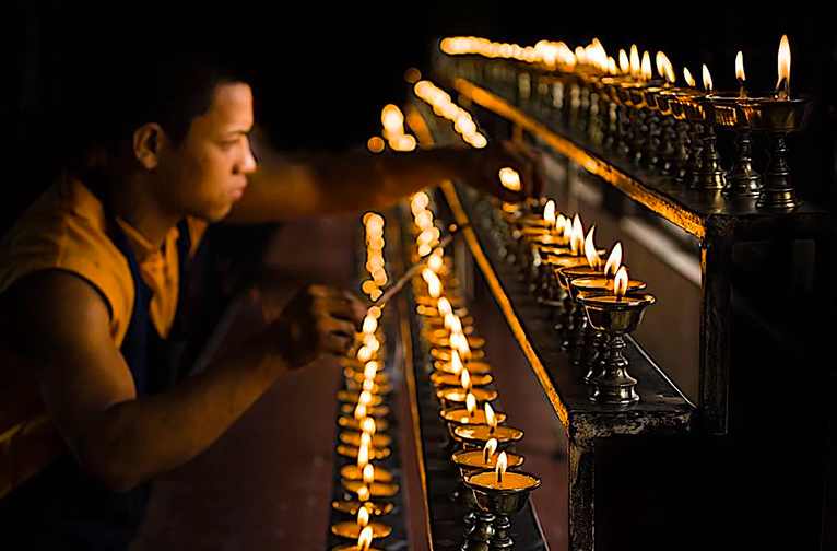 The sacred, reflective Buddhist ritual of butter lamps seeks the removal of the darkness of ignorance and the pursuit of the light of wisdom. All over Bhutan, you will discover this evocative ritual being conducted in homes and temples, monasteries and small shrines. Through this serene, time-honoured daily ritual, people of all ages invoke the blessings of the divine, seeking to accumulate merit, enlightenment, and peace of mind. The lighting of the lamp is followed by the marmey moenlam prayer, seeking to dedicate one’s merits to all other beings for their escape from darkness.