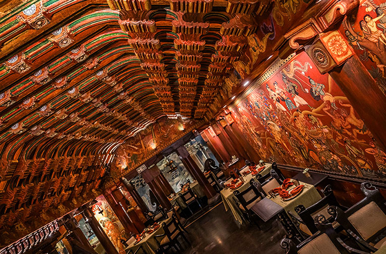 The layered ambience of The Spice Route, is underpinned by its glorious murals hand-painted with 3,000-year-old vegetable dyes by artisans from Guruvayur, the Thai sculptures, treasured antiques— Oh Lord! We are talking about the entire décor at large— all delivered by the inspirational artisanal touches from across South and Southeast Asia.